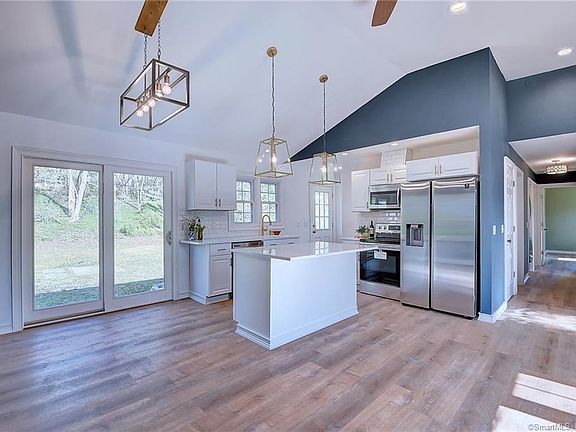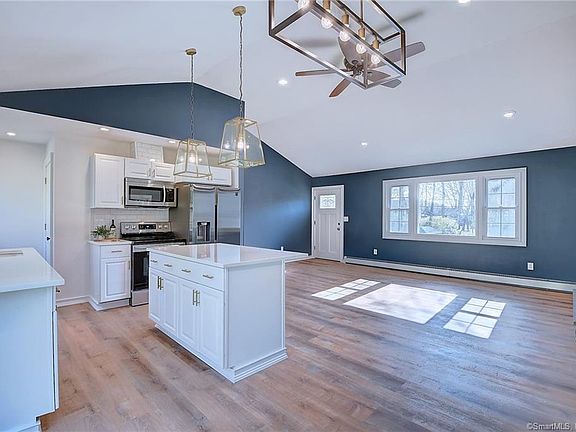 Welcome Home! Completely renovated one level living. Bright open concept and cathedral ceilings welcome you through the front door into the main living room with custom stone front fireplace. Gorgeous white kitchen with quartz counter tops and stainless steel appliances. Kitchen Island conveniently set adjacent to your living and dining area allowing easy entertaining space. Slider off the kitchen leads to a private spacious backyard. Primary bedroom with tiled walk in shower and tile floor. Main Bath with Tiled Tub/shower and floor. Two additional bedrooms , smaller of the two would make a great home office nursery or additional closet space. Laundry conveniently located on the main living level. Lower level is ready and waiting for new owner's ideas, already sheet rocked and heated, could easily be finished off for additional family room or living space. Access from the lower level into the two car garage. All new windows other than living room picture window. New doors, all new finishes, floors, bathrooms and all permits were pulled through the town. This home is located in this sought after town of Cheshire, voted by Money Magazine as one of the 50 Best towns to live in the Country. Award winning schools ,Farmington Canal Heritage Trail and lovely quaint center for shopping and restaurants. Easy access to Rte 84 ,Rte 691 and Amtrak station.