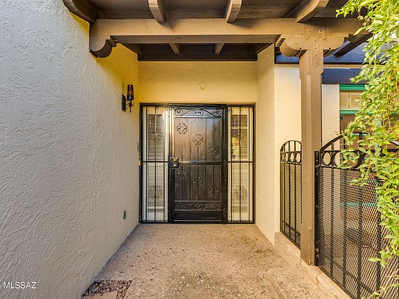 Unique 2BR, 2BA, burnt adobe townhome (w/2-car open carport) is perfectly situated on a cul de sac, just steps from the primary community pool/spa. This home has a beautiful enclosed rear courtyard offering privacy just off the living room and covered patio. High ceilings with exposed beams in living/dining room with corner fireplace. Catalina mountain views from the front, with a Finger Rock view from guest bedroom. Short distance to La Encantada & other shops, restaurants & galleries at Skyline/Campbell. This wonderful community boasts 3 separate pools (one heated year-round w/a spa), walking paths, & LOW HOA FEES.