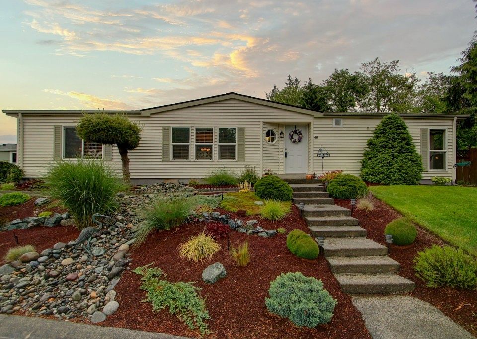 Enjoy 55+ living in a beautifully updated home in Little Mountain Estates, with views of Little Mountain. Creek & mature trees with two tiered new decks in backyard. Easy care vinyl siding, new closed in garage with lots of storage. Updated open concept kitchen. Master suite with updates to bathroom, walk in closest & 2 more bedrooms & bath. New carpet throughout home. Large laundry room. Many community features, gated entrance, large clubhouse, heated pool, RV parking, & much more.