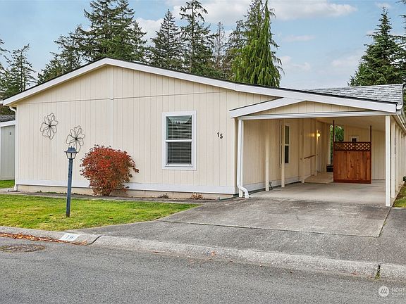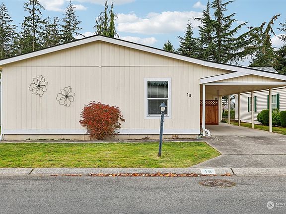 Welcome to *the newest home* in Little Mountain Estates, one of WA's top 55+ parks! Gorgeous 2014 home with open floor plan, 3 bed/2 bath, spacious living room, and formal dining space that can accommodate a large dining table—perfect for entertaining! All the interior has been tastefully renewed with new paint, new carpet, new 2" blinds, and new trim throughout. Step outside and enjoy the beautiful backyard, facing a green belt for added privacy. Other great features include a new entry porch, Leafguard gutters, heat pump, new stove with gas range, and a storage shed. Enjoy the park amenities, such as the clubhouse with heated pool and RV storage. Great location close to all services, trails, medical & hospital, plus easy I-5 access.