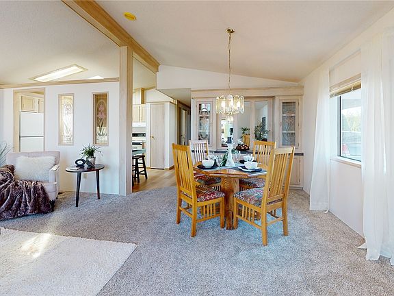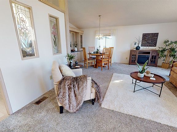 Home features bright open floor plan, central air conditioning, 2 large bedrooms and 2 full baths. Attached carport, heated shop or storage. Beautiful mature landscaping. Very private and quiet patio in backyard. Park amenities include clubhouse and heated pool.