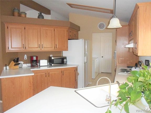 Well maintained 3 bedroom 2 bath home on large corner lot in the desirable Sunrise Vistas subdivision. Freshly painted interior with new carpet. Bright open kitchen with breakfast bar. Plenty of cabinet and counter space. Casual dining area is perfect for entertaining. Spacious living room with beautiful dormer windows. Large master bedroom suite. Master bathroom boasts relaxing garden tub, walk in shower, and dual sinks. Two good sized guest bedrooms and full guest bathroom. Laundry / utility room with sink and cabinets. Giant pool sized back yard that has full length covered patio for shady afternoons! Need parking??? Home has over-sized two car garage with new evap cooler AND an additional RV garage that's 37' long, 15' wide, and roll up door that measures 11.5' tall and 10' wide. Additional parking on the side as well! Low maintenance landscaping front and back. Completely fenced. Community has two pools, dog park, basket ball courts. Minutes to the Colorado River, Lake Mohave, Laughlin casinos, shopping, dining, medical, and schools. Buyer to verify flood plain, utility, sq footage and all pertinent info.