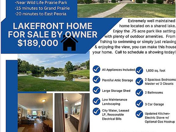 2 bed, 2 bath, shared lake, .75 acres, enclosed dog kennel, and many updates. Great location & close to Peoria/East Peoria. Elmwood school district.