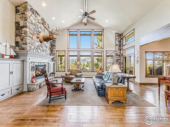 Stunning custom home located in the prestigious Thunder Mountain community, offering breathtaking views of Rocky Mountain National Park. The main floor features an open floor plan, beginning with the Great Room that boasts vaulted ceilings and access to a large deck area. The spacious gourmet kitchen, complete with a large island perfect for gatherings, seamlessly connects to the dining area. The Primary Suite includes a luxurious bath, and the main floor also has two offices on opposite sides of the home, plus a convenient laundry area. The lower level offers a large family room, a cozy dining and kitchenette area, two bedrooms, a full bath, ample storage, and a walkout patio. Additionally, there is an outside storage area. The home includes a three-car oversized garage. This home is a must-see to appreciate all the thoughtful details and quality craftsmanship that went into its design.