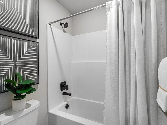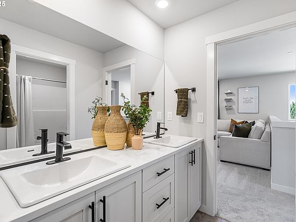 Gorgeous kitchen that features a huge quartz island with shaker cabinets, a convection oven, a gas cooktop, pantry, built in microwave and SS refrigerator. Expansive LVP floors extend through the entry, dining, and kitchen areas. There is a den/office with french doors plus a guest bedroom with a full bath on the main level. Expansive primary bedroom upstairs with extra retreat area. Primary bathroom includes tiled shower, tiled soak tub and quartz counters. Bonus room has so many possibilities! Enjoy the covered back patio overlooking fully landscaped and fenced yard with sprinklers. Home includes, Washer and Dryer, Refrigerator, and window blinds. Just 25 mins to PDX. Sample Photos from another model home, finishes may vary. Homesite # 114, estimated completion September 2025.