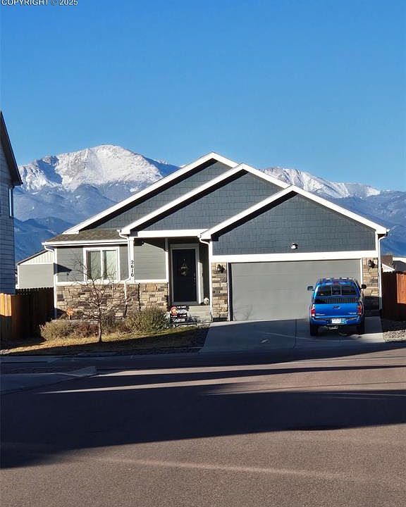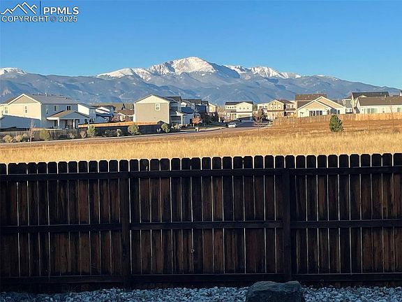Enjoy panoramic views of Pikes Peak and the Front Range Mountains with this beautifully maintained 4 bedroom, 3 bathroom ranch style home with a 2 car garage and finished basement which was built in 2020! Enjoy the flowing floorplan, with the family room with stone surrounded fireplace, that opens up to the kitchen and dining areas. Granite countertops and large island in the kitchen. The main level primary bedroom has a generous walk-in closet. Another bedroom, full bathroom and laundry on the main level. The basement has two bedrooms, a full bathroom, extra storage and a spacious flex room that can be used as a family room, play area, office, or whatever your heart's desire. New LVP in kitchen, dining, living room, and large flex room. An even newer water heater installed in 2024. Water softener and the solar panels will be paid off at closing! Walk out from the dining area to soak in the Pikes Peak views and incredible Colorado sunsets off the back stamped concrete patio with gas firepit while still maintaining privacy with a recently stained 6 foot wood fence. Easy maintenance pet turf and landscaping in the rear that is backed by a huge 5.6 acre open field behind the house that will be a future park. If you like entertaining or being private, this is it! Convenient location that is very close to shopping, dining, and the military bases! This is an amazing launch pad for all your Colorado Adventures!