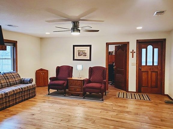 So much offered in this welcoming 3 bedroom home with no step entry, to start with it has beautiful custom wood work throughout, solid wood doors, wood floors, the workmanship is beautiful!!! So much has been updated in recent years to include the roof and guttering, HVAC, it has a tankless hot water heater for instant hot water, updated windows, electrical panel, other features include an attic fan and cozy fireplace! Let's not forget to mention this home sits on over a 1/2 acre privacy wood fenced lot plus the fantastic shop is 40 x 24 with a loft, plenty of room for cars and plenty of working space (talk about storage!) also, a 14 x 10 storage building plus another shed. This super-sized back yard has a covered patio that will be great for outdoor entertaining come spring.