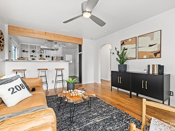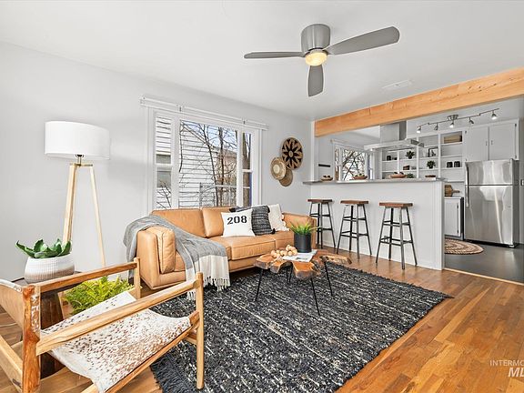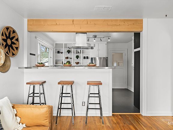 Combining affordable & adorable, this charming bungalow in Boise's West End features hardwood floors, open kitchen to living, updated bathroom, energy efficient windows, a low-maintenance metal roof & siding, lined with lavender bushes with raised beds in back. All square footage is on the main floor including an oversized laundry & utility room that features utility sink for a place to work on projects, gardening and crafts. A detached heated garage (with alley access) has been finished with drywall, paint, flooring, and large windows added, plus skylights to function as an artist's studio or home office space. A large back yard with mature trees plus three patios, one surrounds in-ground fire pit, low-maintenance xeriscaping, and grass with auto sprinklers. Situated a short distance to downtown and Esther Simplot Memorial Park & Quinn's Pond, conveniently located near the Alchemist Coffee shop. A great spot to call home or invest in a Boise rental.