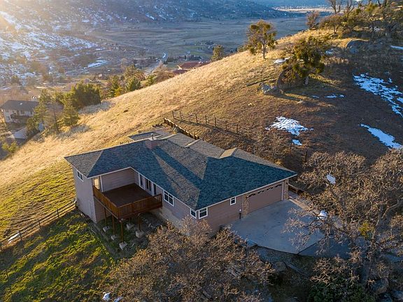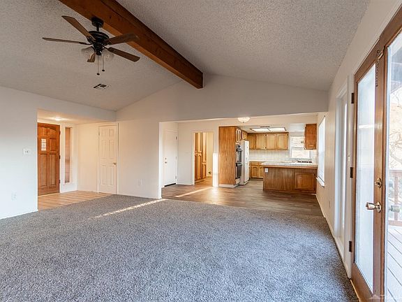 This home has views and a fabulous deck to sit on and watch the sun sets. Deck is living room and master bedroom.This home has open living room and kitchen concept. There are double sinks in both baths master has shower only and guest bath has sink and tub. hallway has large area of cabinets for storage. New carpet and paint inside. The deck has been redone and has awesome views.All the bedrooms are good size and maybe even with some grading make a spot for your horses.New septic tank installed 3/2020