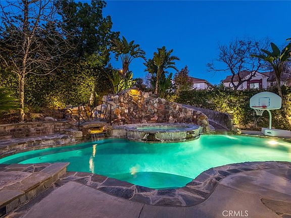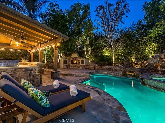 Come see this gorgeous Executive Pool Home at the top of Stevenson Ranch. Walk in and experience a comfortable modern farmhouse esthetic and an understated element of elegance. Situated on a desired corner lot, this home features 4 bedrooms, 3 baths, office (possible 5th bedroom,) loft, formal living room, and a fabulous great room. Upon entering, fall in love with the custom wrapped dark walnut structural beams adding a flavor of luxury, reclaimed wood accent wall, large plank wood-like low maintenance ceramic tiled floors, designer light fixtures, inviting paint selections, oversized base moldings, plantation shutters and tons of large windows filling the space with natural light. Enjoy professional audio/visual system including home surround sound entertainment system making you feel as though you have your very own home theater in every entertainment space. The upgraded kitchen includes stainless steel Kitchen Aid appliances, large center island with seating for four, newer cabinetry, quartz counters, tumbled stone backsplash, and under cabinetry counter lighting. Walk upstairs and find the enormous loft with shiplap accent walls...perfect for a home office, game room, gym, or home theater. The additional bedrooms are generous in size and have ample walk in closet space. The hallway bath has been remodeled including a new vanity with Carrera marble counter top, custom tiled shower and luxury plumbing fixtures. The Primary Suite enjoys beautiful views of the private oasis, huge walk in closet with custom organization system, cozy fireplace and a private ensuite bath with large soaking tub and walk in shower. Outside, enjoy your own piece of paradise and entertainer's dream with a private pool, spa, rock waterslide, stone fireplace with romantic seating area and an outdoor kitchen with bar seating. Feeling like you have your own private resort, you will love the landscape lighting and covered patio for those beautiful evenings. Don't miss the energy efficient upgrades including; SOLAR, newer HVAC system, new pool pump and LED lighting. Close to to award winning schools, parks, shopping and easy access to the freeways!
