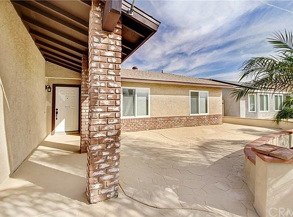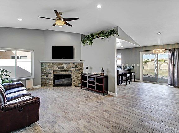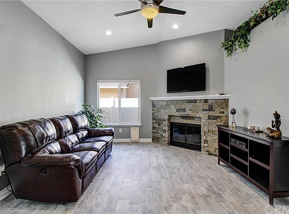 This home is the most turn-key property available in this desirable community of Lazy Creek with no HOA and super low taxes! Pulling up to the property the curb appeal is beautiful with palm trees, fresh mulch, just enough green grass and a front porch sitting area. The home has a newer roof, windows, paint, heater and patio cover. You walk in and there's new wood-look-a-like tile through out and fresh carpet in the four full bedrooms. The kitchen has granite counter tops, upgraded backsplash, stainless-steel appliances and dark cabinets with new hardware and recessed lighting along with lighting under the cabinets. Fireplace is upgraded with a concrete/stone design and all new tamper-proof outlets throughout the home. Both bathrooms have brand new white vanities with soft-close features, new mirror and light fixture, and new shower/tub enclosures and toilets. You have no backyard neighbors with a cinderblock wall and side fences are upgraded white vinyl. All the interior doors are new with new hardware and all four bedrooms have remote-controlled ceiling fans and ceiling fan in living room. Upgraded baseboards in living area and new dining area light fixture. Backyard has privacy, a few palm trees, patio slab and patio cover along with a sprinkler system already ran so you can add grass or leave it "hard-scaped." Pack the moving truck and simply unload in this beautiful, cost-effective, turn-key home!!!!!!