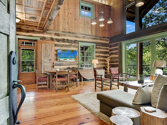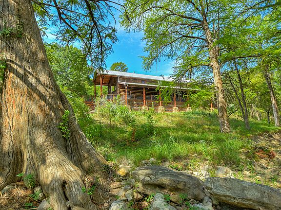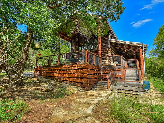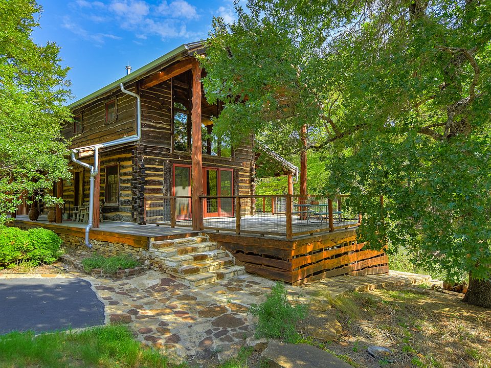 Live amidst nature's splendor in this spectacular 3,128 sf lodge set right above Fall Creek on 10.9 acres of the best of the Texas Hill Country. The storybook 5 bed/6 bath home was built in 2004 and modeled after Texas cabins from the 1800's. Designed and hand-built by master craftsmen using a combination of antique and reclaimed materials the result is a masterpiece that has been featured in "Country's Best Log Homes" magazine and "Cabin Living" magazine. The crystal-clear water runs alongside the property for over a third of a mile and is graced by massive, towering cypress trees. The relaxing and calming sounds created by the cascading water can be heard and enjoyed from throughout the home. The property has a well, nature trails traversing limestone cliffs and grottoes and an organic garden. The home is connected to the grid and has all the conveniences of modern life but also provides an off the grid living option if desired with the large solar panel array and rain collection system.