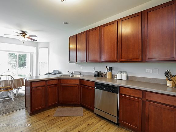 Spacious sought after end unit with 3 large bedrooms, 2 1/2 baths. Most rooms freshly painted. New foyer, kitchen and bath floors, new granite vanity tops in master and hall baths! Soaring vaulted ceilings in Master bedroom & 2 Walk in closets, 2nd bedroom also has a walk in closet! Handy 2nd floor laundry room. Stove is 1 year, carpet is newer, 9ft ceilings throughout first floor, upgraded 42" cabinets! Very open view into yard & backs to greenery and a single family home with huge open grassy space! Outstanding location, walk to Algonquin Commons shopping, Walmart & many restaurants! Hurry on this only model in subdivision available at this time!
