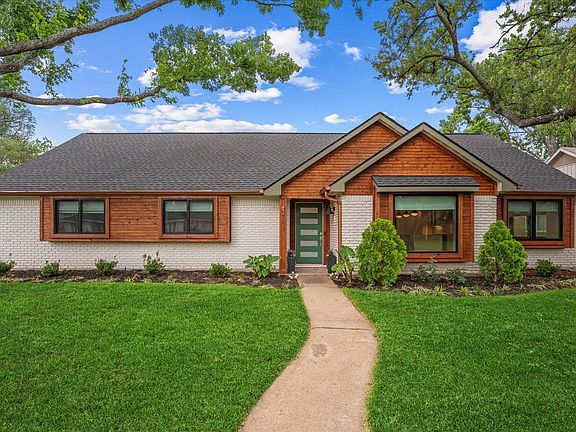 Step into this exquisitely reimagined modern ranch in sought-after Spring Shadows! This stylish 4-bedroom home offers incredible curb appeal with painted brick, cedar accents, and mature oak trees. Inside, a bright open-concept layout is filled with natural light through premium Andersen black windows. At the heart of the home is a chef’s kitchen with a stunning waterfall-edge quartz island, custom white shaker cabinets, a 48” professional Italian gas range with double ovens and dual rotisseries, and a commercial-grade vent hood. The living area features a sleek electric fireplace, custom media wall, and elegant lighting throughout. Wide-plank tile flooring flows seamlessly across the home. The luxurious primary suite boasts a spa-inspired bath with a deep soaking tub, walk-in shower, matte black fixtures, Bluetooth speakers, and a boutique-style closet with custom drawers, shoe racks, and a full-length mirror. Expansive backyard, covered patio, and detached garage complete the home.