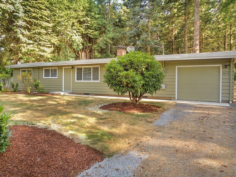 Tastefully updated 3 Bedroom, 1.5 Bath Ranch with beautiful hardwood floors throughout. Living room, dining, family room, kitchen equipped with range, refrigerator, dishwasher, and microwave. Laundry with washer/dryer hook ups. Electric heat, A/C (Well and Septic). Single car garage, RV parking, large backyard with patio storage shed, approx. 1568 sq. ft., built in 1959, 98607. SM PET NEGO