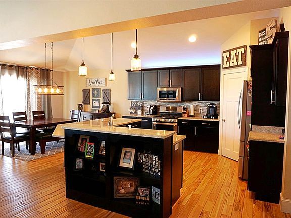 As you enter this 4,200 SqFt ranch-style home, you are welcomed by beautiful hardwood floors running their course throughout the open concept of the living room, dining room and kitchen. You'll quickly take note of the industrial-style light fixtures providing perfect accents throughout the main level. The living room features a cozy, stone fireplace along with large, panoramic-like windows. The dining room is perfectly situated next to the kitchen area and provides access to your spacious walk out deck. The kitchen is beautifully finished with granite counter tops, tiled backsplash and a walk-in pantry. Located off the kitchen is the perfect laundry/mud room showcasing a dramatic wood-planked wall, a wash sink perfectly complemented by butcher block countertops, custom cubbies and access to your triple stall, heated garage complete with floor drains! Also found on the main level is a full bath and 3 bedrooms, one of which is the master suite which provides access to your walk-out deck, spacious master bath featuring dual sinks, a walk-in shower, and an ample walk-in closet finished with custom cabinetry. The walk-out basement offers a large family room featuring a wet bar, a non-egress room, perfect for your in-home workout studio, bedrooms 4 & 5 along with another full bath! Call today to take a look at this beautiful home!