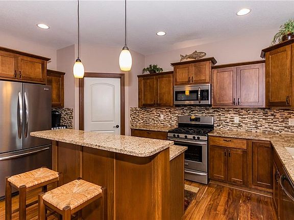 Huge garage that is 24â deep and 3rd stall that is 28â deep for you large truck or toys. This beautiful Grimes ranch contains tons of upgrades that includes a gas stove, large pantry, double showers in the master bath, large storage closet and built-in bench/coat rack in the mudroom, nine foot ceiling on both levels, vaulted ceiling in the living room with floor to ceiling stone fireplace, two bedrooms and bathroom in the finished walkout basement, wet bar with full size refrigerator in the family room, granite tops throughout house, natural gas hookup on deck for BBQ grill, wired for hot tub on patio, both deck and patio sliders have blinds built-in, loft storage in garage, epoxy garage floor, garage service door, garage keypad, lawn irrigation, nicely landscaped yard, and more. You wonât find all this in new construction at this price. Elementary is located nearby.