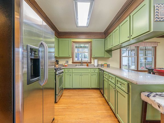 - RoomKitchenFeatures: Eat-in Kitchen, Floors-Hardwood, Bar, Cabinets-Painted, Counter Tops-Solid Surfac