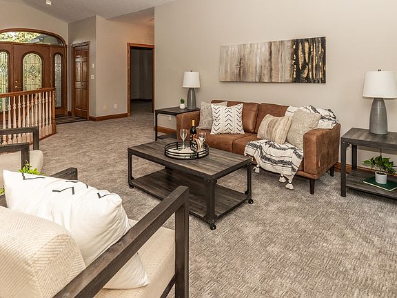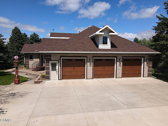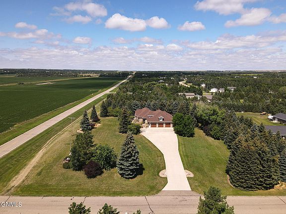 This quality built Ranch style home is nestled in the trees on 2 acres in a desirable NE rural Bismarck area. This custom built home has been the home of the developer of Sunny-View addition since the home was built! The spacious home boasts 2767 sq ft on the main floor! The kitchen features custom Klemetson cabinetry, newer Cambria quartz counters and newer stainless appliances including a wall oven and cooktop range. The Huge living room is open to the kitchen and dining areas and has an open staircase leading to the lower level. New carpet and luxury vinyl plank flooring was just installed throughout the main floor and the interior of the home was just painted. There are patio doors leading to the newer maintenance free deck and the very private backyard surrounded by trees. There are 3 bedrooms on the main including the HUGE primary/master ensuite with dual walk-in closets and a spacious bath with corner jetted tub and walk in shower. The vanity offers Cambria quartz counters. The main bath also has Cambria quartz counters. The very spacious lower level has a HUGE family room and a game area with a pool table included. There is a wet bar with plenty of space for pub/game tables. There is another bedroom and bath down also with quartz counter. The lower level also has a root cellar/tornado shelter that is all concrete. There is a large storage area and utility room. There is a central vacuum system in the home. Other features are solid paneled doors, wide baseboards and trim, custom ceilings (some embossed wallpapered ceilings). The home has rural water but also has a well that is used for watering the front yard shrubbery. The 1146 sq ft heated garage has epoxy floors and water. Just off the garage is a large mudroom and a half bath. The large driveway has space for at least 8 vehicles!