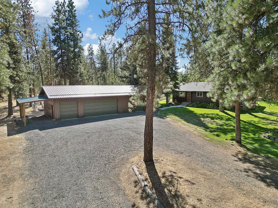Welcome to this quaint country oasis on 4.6 ac just 20 mins to the airport and 25 mins to downtown Spokane! There are 3 bedrooms on the main floor and lots of updates which include: new LVP flooring, kitchen remodel (2023) with can lights, new cabinets, stone counters, new appliances and a wall removed to create great room concept. Both bathrooms have been updated, new roof (2024), new pressure tank for the well (2020). Downstairs has oodles of storage space, a bedroom w/egress window, and potential for an additional rec room. The shop was reconfigured and finished with concrete floors, new metal siding & roof, drywall, new 8 ft doors, large workshop\garden hobby room, and 3 bays for parking, plus there is an electrical hookup for an RV. Entire shop and garage area are insulated & heated. The above ground pool is fenced and has power. A beautiful garden area and large parklike yard top it all off! This one is truly a must see!