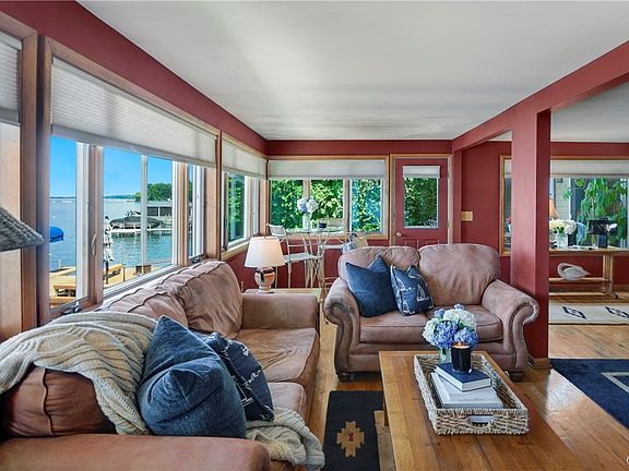 Fantastic level waterfront property on the East side of Skaneateles Lake. The second you enter the home you are greeted by incredible water views from every room. The easy floor plan offers such beautiful natural light throughout the home. The property is equipped with nice sized kitchen with sliders off to the deck on the north side of the property, formal dining room, first floor laundry, full bath, and an oversized family room with several areas to sit and enjoy the lake plus a cozy wood stove fireplace to nestle up to on cold nights in the fall and winter. The den has a fantastic bar great for entertaining and another set of sliders onto the south end deck. The second level has an oversized bath, primary bedroom with gorgeous lake views and a little reading nook also overlooking the lake, two other ample sized bedrooms. The waterfront is level with a beach great for gradually walking into the lake. The south side of the property has a natural stream that runs into the water. This is the first time this gem has been offered for sale in over 40 years. The home is only a few miles outside the village, schools and shops. All in the award winning Skaneateles school district.