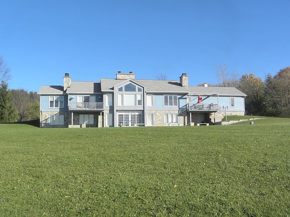 Over 18 Acres of quiet privacy overlooking Skaneateles Lake await you in this contemporary ranch. Not a house in site, just you and nature. Enjoy Lake and dramatic season changing views from almost every room. The open floor plan with cathedral ceilings and abundance of windows bring the outside in. Curl up to one of 4 fireplaces flanked in natural stone. Hardwood floors throughout the main level. The oversized master suite features a deck, gas fireplace, library, Jacuzzi tub, shower and built-ins. Lower walk-out level has 3 more large bedrooms, each with their own bathrooms. Exceptional quality and detail make this home both comfortable and sophisticated. More features include excellent mechanicals, generator back-up system, central air and new roof. The property is also certified as a Bed and Breakfast.
