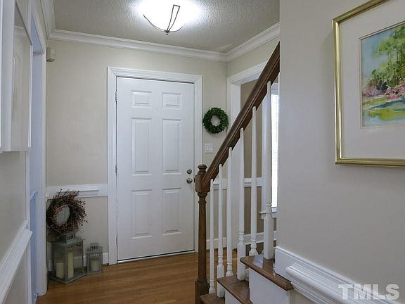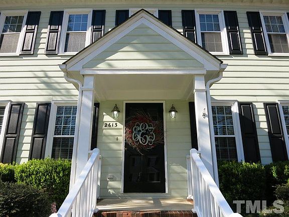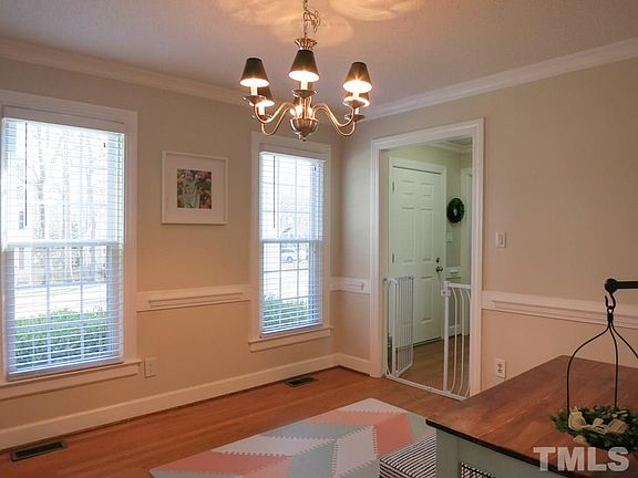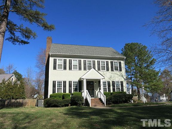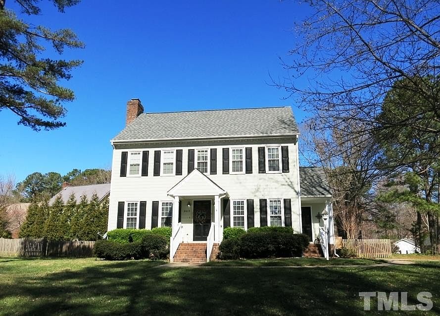 UPDATED 2-story on corner lot w/Deck in fenced backyard located in Durant Trails w/pool, tennis & playground available, near I-540/Triangle Town Mall. Roof 2012, HVAC 2008, water heater 2009. Updated KIT w/granite/SS/subway tile/sunny bay-windowed Bfast area w/built-in hutch & wine rack; lg front-to-back LR w/brick FP & french drs to Deck; formal DR w/hardwd flr, crown-chair rail molding; SPACIOUS MBR w/WIC & private Bath w/lg shower/vessel sinks!