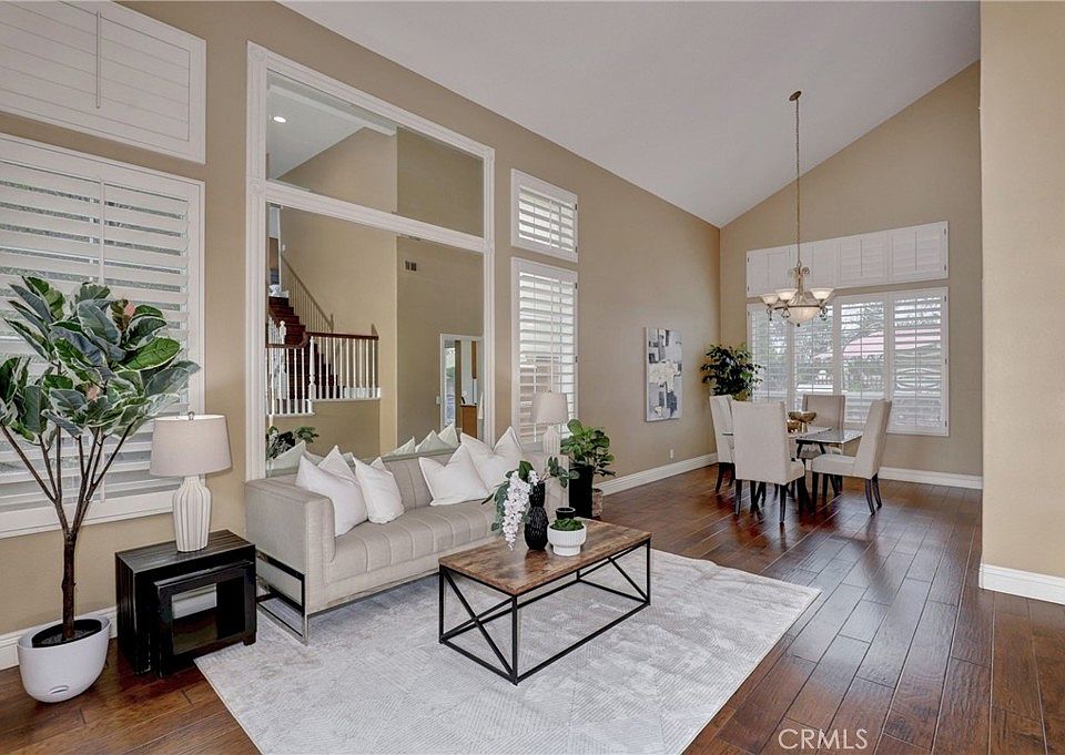 Welcome to 26132 Calle Cresta, where class meets comfort in the heart of Mission Viejo. Located on a quiet cul-de-sac street, this beautiful residence boasts 4 bedrooms (1 downstairs), 3 bathrooms of move-in-ready bliss complete with artificial grass in the front and back yards for a pristine, low maintenance appearance. Step inside and be greeted by soaring two -story vaulted ceilings, the warmth of wood flooring throughout, and the charm of plantation shutters adorning the windows. The spacious layout effortlessly blends style and functionality, offering a seamless flow throughout the home. The formal living and dining room as you enter the home add an elegant touch, perfect for entertaining guests or enjoying intimate family gatherings. The heart of the home lies in its updated kitchen, where your culinary dreams come to life with sleek countertops, stainless steel appliances, and ample cabinet space. Adjacent to the kitchen, the inviting living spaces beckon you to unwind and entertain. Host gatherings with ease in the welcoming family room, complete with a cozy fireplace and views of the picturesque surroundings. Before heading upstairs, there is a convenient downstairs guest bedroom with great light and French doors and is currently being used as a den/office, and an upgraded downstairs guest bath with a step-in shower, making this section of the home perfect for visiting guests. An inside laundry room completes the lower level. Once upstairs, the bedrooms begin with a luxurious primary suite featuring great space and light from vaulted ceilings and multiple oversized windows, and an updated ensuite with a dual vanity, soaking tub, separate shower and walk-in closet. Two additional bedrooms, each with elegant wainscoting and an abundance of natural light, an updated guest bathroom along with a large linen closet, complete the upper level. Step outside and discover your own private oasis in the expansive backyard. Whether you're soaking up the sun on the patio, hosting BBQs with friends, or simply enjoying the stunning views, this outdoor haven is the epitome of California living at its finest. With a three-car garage with epoxy floor covering and ample storage space AND Lake Mission Viejo privileges, every convenience is at your fingertips. Plus, sought-after Bathgate Elementary School is just a short stroll away, making morning drop-offs a breeze. This is more than just a home—it's a lifestyle. Don't miss your chance to make it yours today!