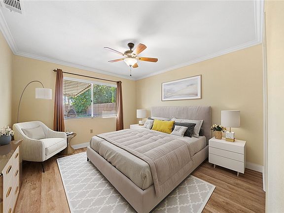 luxury vinyl flooring with large baseboards and custom crown molding. Living room has a beautiful brick fireplace with mantel with windows to allow natural light. A separate dining area is located right off the kitchen by the large sliding glass door. Croian kitchen counters that look like granite with a dual stainless sink that looks out into the covered patio. The front bedroom has dual closets with mirrored wardrobe doors. The back primary bedroom has a walk-in closet and large window for natural light. The single bathroom has granite counter and has an additional door that can access this bath through the second bedroom. Garage is large with access to home through the courtyard and is attached. Backyard is quite spacious with the large patio cover and green plants around. No home directly behind. The community offers a clubhouse, recreation room, pool, spa and is all included in the HOA fee of $50/mo.