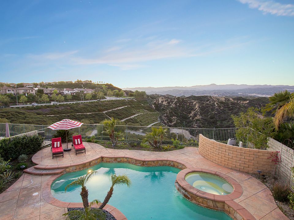 This chic and stylish 2-story panoramic view home is one of the finest in Stevenson Ranch. Main level: high ceilings, stunning living room/fireplace, grand dining room w/ French doors opens to breathtaking California terrace w/ saltwater pool, spa, BBQ deck & porch w/ sitting area. Chef’s island kitchen, sunny breakfast nook, family room/fireplace & custom built entertainers bar, bonus room w/ built-ins currently used as study/gym. Upstairs: Luxurious master suite, master bath, walk-in closet, private deck w/ spectacular views & 3 additional pristine bedrooms. Highlights include: lots of storage cabinets, wood shutters, recessed lighting, convenient access to town.
