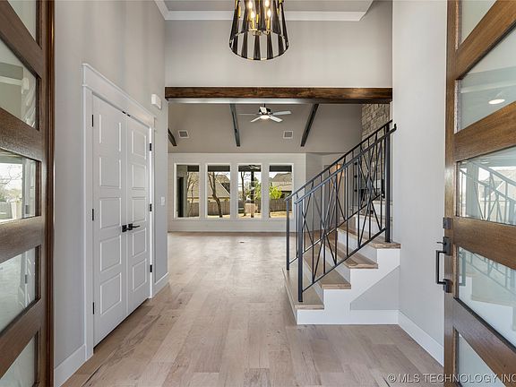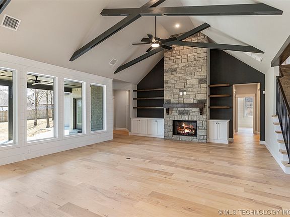 Beautiful new construction home on a half acre corner lot loaded with upgraded features in Bixby's Gray Oaks! Extensive professional landscaping and a backyard full of mature shade trees. Large covered patio with wood burning fireplace. Open concept living with vaulted, beamed ceilings and floor to ceiling stone fireplace. STUNNING kitchen boasts a prep/bar area ideal for entertaining. Primary suite and second bedroom with ensuite bath on the main floor. Huge gameroom, two bedrooms and a full bathroom upstairs. Neutral color palette with designer finishes.
