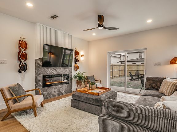 The chef's kitchen boasts stainless steel appliances, a large island, and is stocked with premium cookware. Upstairs, the primary suite includes dual sinks, a walk-in shower, and soaking tub. Outside, enjoy a private fenced yard with patio, fire pit, and barbecue grill.