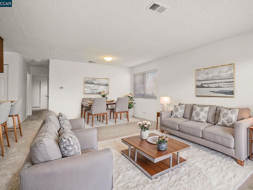 This delightful single story end-unit condo is move-in ready with new carpet and fresh interior paint. The spacious living area is filled with natural light streaming through sunny windows. The kitchen features tile countertops, a breakfast bar, a pantry, new freestanding oven/range with a decorative backsplash, and a dishwasher. Enjoy the convenience of an inside laundry closet with washer/dryer hookups. The updated hall bath boasts a new shower over tub with a sleek tile shower surround. Relax in two generously sized bedrooms, including one with a sliding door leading to a private, enclosed brick patio. Additional highlights include two assigned parking spaces—one covered carport and one uncovered space. Conveniently located near shopping, dining, freeway access, and public transportation.