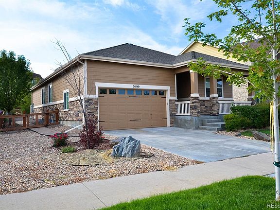 This gorgeous ranch home with a Main Floor Master Bedroom in Serenity Ridge community. This home features hardwood floors, two generously sized secondary bedrooms with accompanying bath, main floor study with french door entry which is situated at the middle of the home. The secondary bedrooms are surpassed only by the large elegant master with an en suite master bath featuring granite counters, two sinks, a shower and a large soaking tub. At the rear of the home the family room and chef's kitchen are bright and sunny and will surpass your expectations with granite counters, stacked ledger stone backsplashes, quality cabinets, stainless appliances a large pantry and double ovens. The backyard completes the show home quality with a stamped concrete patio and hot tub. Cherry Creek schools! ! Close to Southlands Mall. Easy access to E-470, Town of Parker.