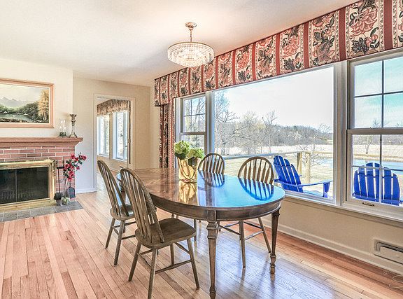Unique property boasting a small lake & native gardens nestled on 1.8 acres, a nature-lovers dream. Charming 4 bed / 3 bath ranch home features: panoramic views through large windows, hardwood floors, 2 fireplaces, open deck with patio below, full finished walkout bsmt with workshop & storage area, high-quality James Hardie siding, newer windows. Outbuilding may be used as 3rd garage or additional storage.