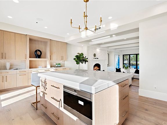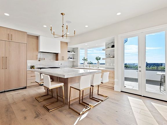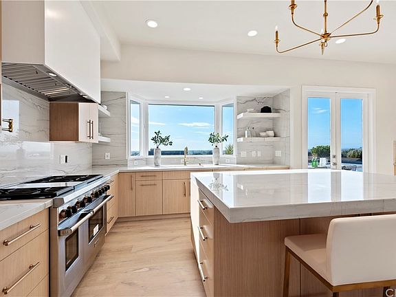 Located on the highest street in Eastbluff, panoramic sunset, city lights and peek ocean views await you from this sleek, extensively remodeled home. It's rare to find a home with views from all bedrooms, kitchen, dining area, and loft. The premium location across from a park, gated courtyard for privacy, a 4-car garage with ample street parking make this the perfect home for entertaining. The open concept floor plan features a large dining area and spacious living room with retractable doors to bring the outside in. The newly remodeled kitchen features a 6-burner Wolf microwave, and range with griddle for weekend pancakes, a SubZero refrigerator, Bosch dishwasher, stunning stone countertops and an island large enough to gather around for breakfast with a view. The downstairs media room includes and AV system and screen--perfect for movie nights. A mudroom with built-in cabinets offers extra storage. With one bedroom suite downstairs and three upstairs, this home is perfect for out of town guests. The master suite will truly take your breath away with with views that stretch to Catalina. Custom beams adorn the high volume ceiling, and the master bathroom is a serene retreat with oversized Carrera marble shower, soaking tub, dual closets and a balcony overlooking Blue Heron Park.
