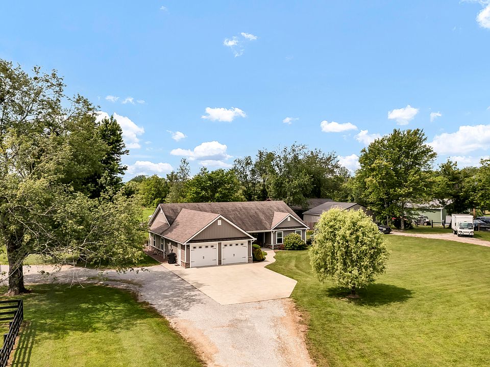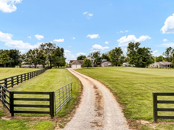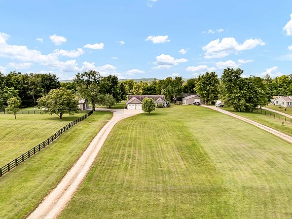 This one-owner, custom-built home sits on approximately 8 acres of beautiful Bluegrass land and offers space, comfort, and thoughtful design throughout. The open-concept great room and kitchen feature exposed beam ceilings and custom-stained concrete floors. The kitchen is a dream for cooks,with abundant counter space, storage, a large island, and window overlooking the backyard and pool. Just off the kitchen, relax in the all-season sun porch. The spacious primary suite includes a luxurious bath with soaking tub, shower, dual sinks, and an enormous walk-in closet. Two additional bedrooms, a home office (which could be a 4th bedroom), full bath and two hot water heaters complete the home. There are 3 exterior buildings: a detached 1,440 sf building which also has a 720 sf guest suite—previously used as a successful five star, Super Host, short-term rental—with its own fully equipped kitchen, living room, bedroom, bath, and w/d stackable. Remaining 720 sq ft is garage space. A greenhouse is attached to 1440 bldg and has both water and heat. Additional buildings include a 4 bent barn with electric, one stall (more can be added),tack room and a 30 x 28' equipment garage.