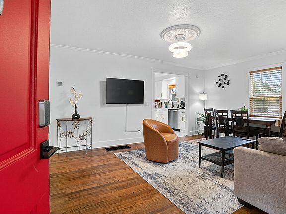 Step inside to an inviting living area filled with natural light, modern furnishings, and a smart TV for cozy movie nights. The dining area connects to a fully equipped kitchen featuring sleek stainless-steel appliances, quartz countertops, and everything you need to cook at home.