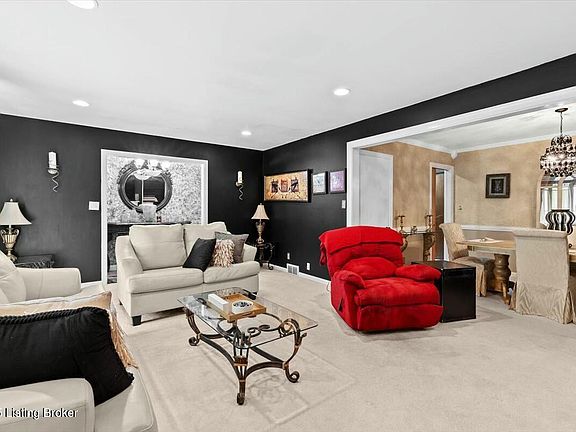 Step into the welcoming foyer, which leads to a spacious living room featuring built-in shelving, a large picture window, recessed lighting with dimmers, and a cozy fireplace. The living room flows seamlessly into the generous dining area, perfect for hosting with ample space for a large table, hutch, and more.