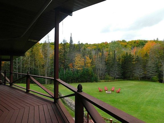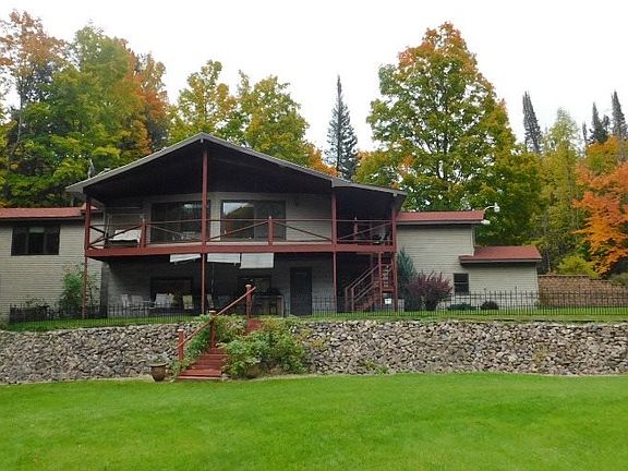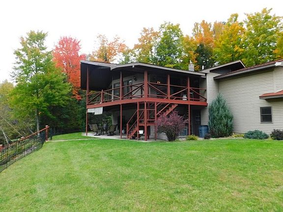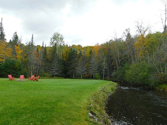 Extraordinary views and over 700 ft of river frontage with small rapids and swimming hole! The picturesque backyard is surrounded by tall, mature trees and privacy throughout the entire 18+ acre parcel, with Blue Ox snowmobile trail on the far corner of the property. The expansive 3 bedroom, 3 bath home, designed with all rooms overlooking the river, features vaulted ceilings, a master suite, and 2 fireplaces. The exposed, walkout lower level offers a summer kitchen and a family room leading to the covered patio. Plenty of storage with an attached garage plus 30 x 48 pole building!