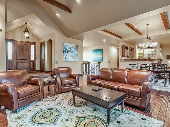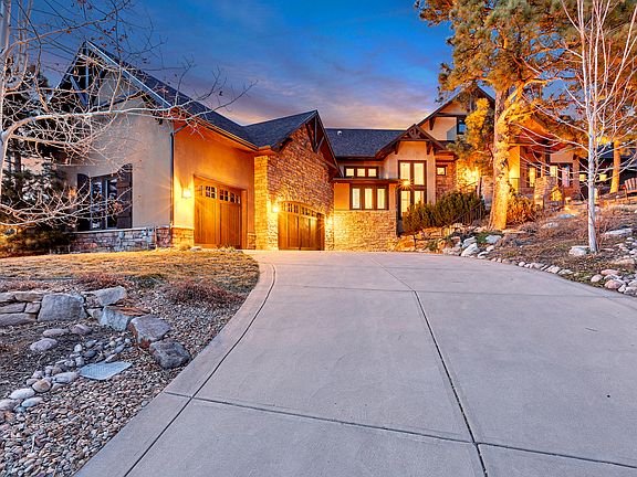 Custom mountain ranch home in Castle Rock! This stunning home boasts hand-scraped hardwood floors throughout, oversized windows, vaulted ceilings w/ beautiful dark wood beams & an open layout ideal for entertaining. The gourmet kitchen features GE Monogram appliances, custom cabinetry, slab granite, a large center island, fireplace & a cozy eat-in breakfast nook. Main living area with oversized wetbar flows perfectly out to a huge 2-tier deck, overlooking private treed lot & views of the Rocky Mountains & Castle Rock. Retreat to your main-floor master w/ stacked-stone fireplace, walk-in closet & spa-like 5-piece bath. Walkout basement includes a home gym, theater room, den, add'l bedrooms & leads directly to the flagstone patio with firepit. In addition to the 7 gas fireplaces throughout, you'll love the water feature with pond (in the front), and for the golf enthusiast, a putting green room with elevation changes and four individual holes. A whole-house control automation system, smart control outdoor irrigation system & brand new roof and gutters. Luxury living with stunning southwest facing views. Book your private showing today!