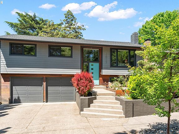 Stunning South Tabor Mid Century Modern split level home. The attention to detail in this beautifully articulated home is what sets it apart from the rest. Every inch of this property has been thoughtfully redesigned to unify an open floor plan with curated accents throughout. The exterior is refinished to include original cedar siding and red meranti tongue-and-groove highlights with soffit lighting. The large custom windows look out over the low maintenance front yard, designed with freeze hardy plants, flowers, trees, and stone features. The upper level boasts hardwood floors and an open concept kitchen, dining area, and living room with a colorful geometric floor-to-ceiling fireplace, the perfect space for hosting. The kitchen features all new cabinets, quartz countertops, Bosch stainless steel appliances, and an island with eating bar, storage and a built-in microwave. The primary bedroom is completely remodeled to include a full bathroom, across the hall from 2 additional bedrooms with a half bath to share. The large family room sits at the bottom of the floating staircase, separated by a custom MCM railing. Cozy up to the wood-burning fireplace, which sits adjacent to the 4th bedroom and remodeled full bathroom. The 2-car garage is accessible through the lower level, which also accommodates a dedicated laundry area. The backyard has entrances from both levels of the house, and it is an entertainer's paradise. The elevated wooden deck is ideal for barbecues, dining alfresco, or relaxing in sun-drenched views of Mt Tabor. The 6-person saltwater hot tub sits nearby so you can take that relaxation to the next level. With grass areas, raised beds, conifers, and fruit trees- this fenced-in backyard is the charming serene oasis you've been waiting for. Welcome home! [Home Energy Score = 5. HES Report at https://rpt.greenbuildingregistry.com/hes/OR10228434]