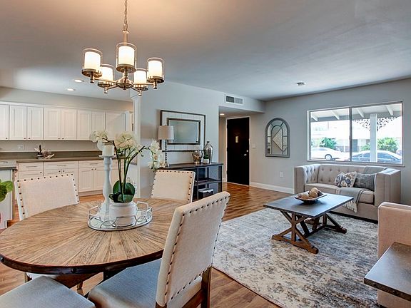 Highly upgraded and professionally designed modern single level two bedroom home located in Sun City Civic Association a 55+ community. This gorgeous home has just being completely remodeled. Upgraded flooring, upgraded baseboards, and new lighting fixtures throughout the home. Highly desired open concept layout with the kitchen, dining area and family room in one great room. The kitchens offers stainless steel appliances, upgraded stone counter tops, custom cabinets, recessed lighting and back splash. Ample natural light flows throughout the home.The living room opens to a large covered back patio ideal for entertainment. There is also a indoor laundry room. Great association amenities include clubhouse, banquet facilities, several pools/spa, sports courts, private golf course, activity rooms, & common RV parking. Don't miss the attached two car garage and check out the virtual tour.