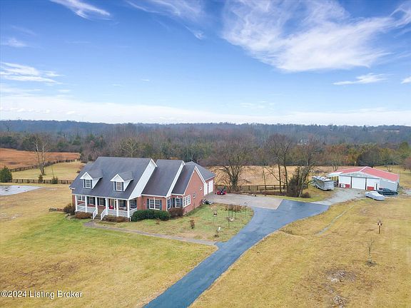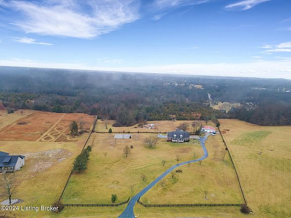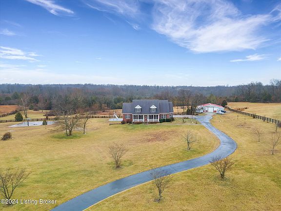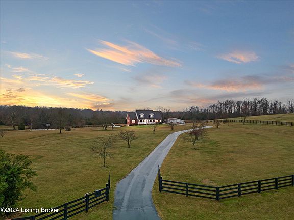REDUCED! REDUCED! OLDHAM County KY HOME nestled within a beautiful well kept neighborhood with no HOA! There is @''5500''sq.ft.'of space. The kitchen has a fireplace, center Island with tons of storage and lots of radiant light. The large great room has a wood burning fp. The Primary is on the main level with its own ensuite. This GRAND home stands as a true testament of a country retreat with an unparalleled 7.6 acres of beautiful land. There is also a in ground pool and a huge Out-Building with air and heat split with spray insulation. Check out the 1/2 court Basketball Court. The expansive walk-out basement is fully equipped with Media room, 2 huge entertaining areas and bath. The decks overlook the acreage and the grand porch is perfect for sitting out front and sippy a iced tea. Two 10x40 concrete pads added to side of outbuilding with roof extended to cover pads. This home although rural is just 10 minutes to shopping, restaurants, GOLF, swimming, Hospital, and anything you might love to do. The Outbuilding also has all new foam insulation and mini split Heater/cooling. 9000lb car lift New LED lighting to garage. Mosconi Pool table and movie projector conveys in Walkout Basement 600 gallon of propane added to buried 1000 gallon tank. Septic cleaned summer of 2023 Propane Tank Rented and approximately over half full 1000 gallon