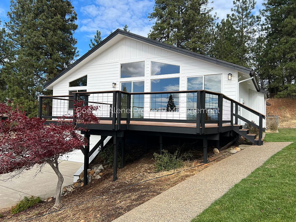 This freshly updated home boasts 3 bedrooms, 3 bathrooms, and breathtaking, scenic views of Coeur d'Alene that can be enjoyed from living room, master bedroom and the new front deck. With brand new custom windows designed to showcase the scenic surroundings, this home features new blinds, siding, paint, and roof. The kitchen comes fully equipped with stainless steel appliances (fridge, dishwasher, microwave, and electric range), and the home offers forced air heating and air conditioning for year-round comfort. Hardwood floors grace the living areas, with plush carpet in the bedrooms. Large bonus room in basement with full bathroom. An oversized 2-car garage provides ample space, while the landscaped yard, complete with a sprinkler system, is perfect for outdoor living. Snow removal/ yard care is included, so you can relax and take in the view.