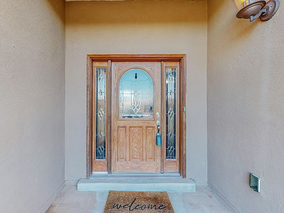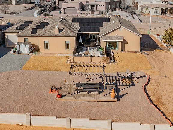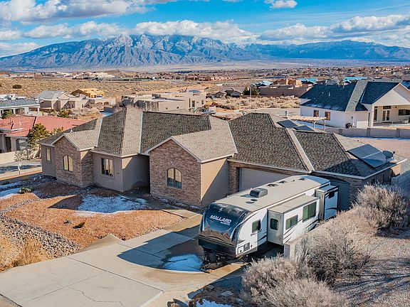 Discover the ultimate luxury living experience in this custom-built single-story home surrounded by breathtaking views of the Sandia Mountains and stunning sunsets. With owned solar panels, enjoy energy efficiency and lower monthly costs, PLUS AN ASSUMABLE 2.46% VA LOAN! The finished 3-car garage, Pella windows, and spacious master with walk-in closets add luxury and style. A Jack and Jill bathroom for guest bedrooms and low maintenance landscaping complete the package. Schedule a showing today and make this dream home a reality!