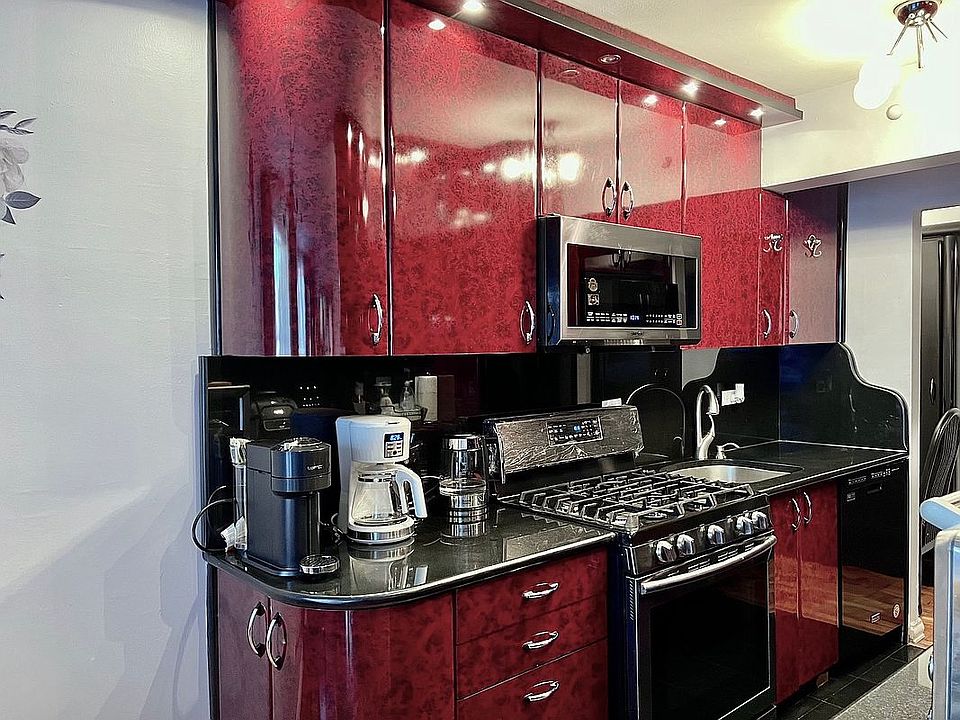 The vibrant galley kitchen with ton of cabinets offers granite countertops, granite floors and brand new ss fridge and a stove range .