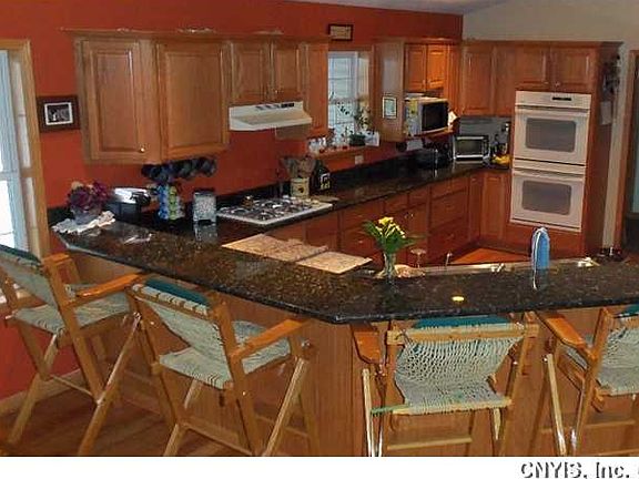 Stunning views from this hillside ranch built in 2002 with true single level living. Entry from porch into a generous mudroom, then into a large open concept living space with cathedral ceiling. Kitchen with granite counter tops and wrap around breakfast bar, pantry and oak cabinets opens to large living room and dining area. The view from the double sliders is spectacular year round. Master with views, two car attached garage, two tiered rear decks, ample storage in lower level which also has a finished bedroom and bath. Additional storage under garage. First floor laundry, central vacuum