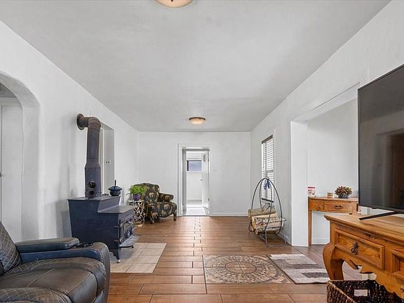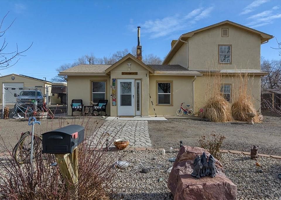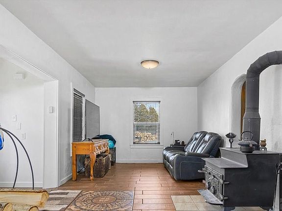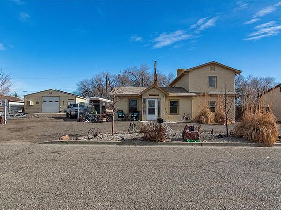 Discover the allure of this exceptional residence situated on an expansive lot. Upon entering through the front door, you'll be captivated by the bespoke tile mosaics that grace the foyer. The spacious living room features a wood-burning stove capable of warming the entire home, providing a cozy ambiance. A convenient guest half bath is strategically located off the living room. The generously sized kitchen boasts new cabinets and stainless steel appliances, complemented by a large pantry that offers ample storage space. Towards the rear of the house lies the expansive and private master suite, complete with an attached bath featuring dual sinks and a walk-in shower. The second bedroom is thoughtfully positioned on the opposite side of the living room for enhanced privacy. Ascend the stairs to discover two additional sizable bedrooms and a full bath, providing flexibility and accommodation for various needs. As a crowning feature, a detached 40x30 garage awaits, equipped with 110 and 220 hookups, a swamp cooler, and a wood-burning stove, ensuring comfort in all seasons. The solar system is fully paid off, contributing to a remarkably low electric bill of just $10 per month. The backyard is a haven, fully fenced with a dog run, a shed, a covered casita area, and abundant parking in the side yard adjacent to the garage. This residence harmoniously combines comfort, style, and practicality to create an exceptional living experience.