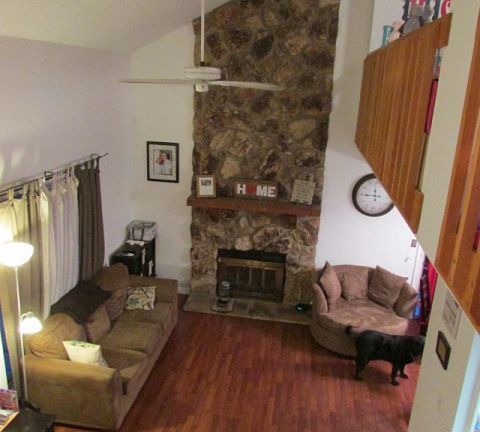 Welcome to this well maintained condo with an excellent location. Tucked into the neighborhood, mature trees, beautiful views and large front porch. Great room offers space for entertaining and a large floor to ceiling stone fireplace. The kitchen is bright and filled with lots of cabinets. Just off kitchen is a powder room and laundry area. Just off of dining area is a 17 x 12 deck with privacy fence. Upstairs is a large master bedroom with walk in closet. The second bedroom could also be used as an office area, very versatile space.